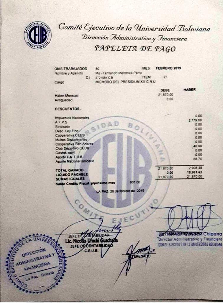 El Dirigente universitario Max Mendoza de 52 años de edad, habría percibido un sueldo mensual de Bs. 21.870.- por ocupar un cargo en la CEUB.