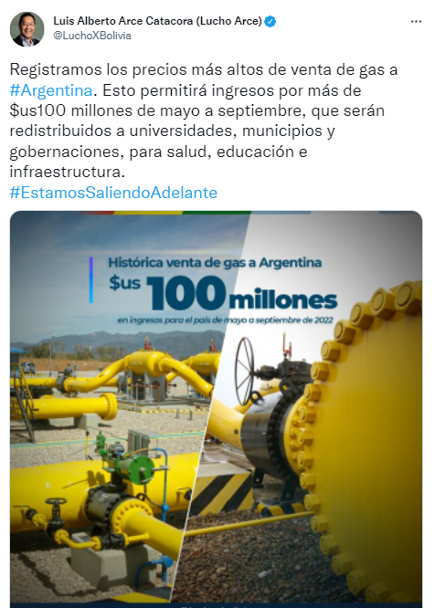 🔵 #ANF | El primer mandatario Luis Arce anuncia, mediante su cuenta de twitter, que se registraron los precios más altos de venta de gas a #Argentina y que los mismos permitirán un ingreso por más de 100 millones de dólares. https://t.co/abXAvGmLvq