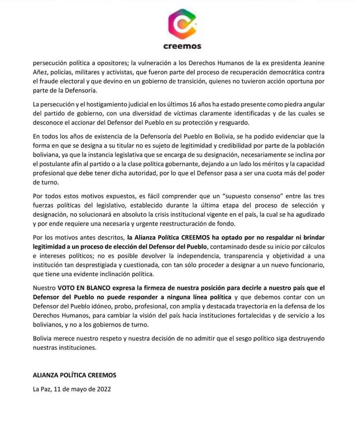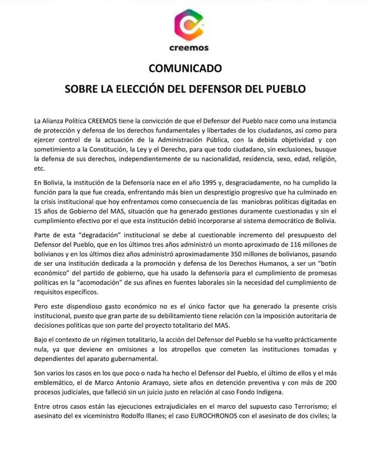 🔵 #ANF | #Política Creemos manifiesta que "no respaldará ni brindará legitimidad a un proceso de elección del Defensor del Pueblo porque está contaminado desde su inicio por cálculos e intereses políticos". pic.twitter.com/jLhBgUDBHL
