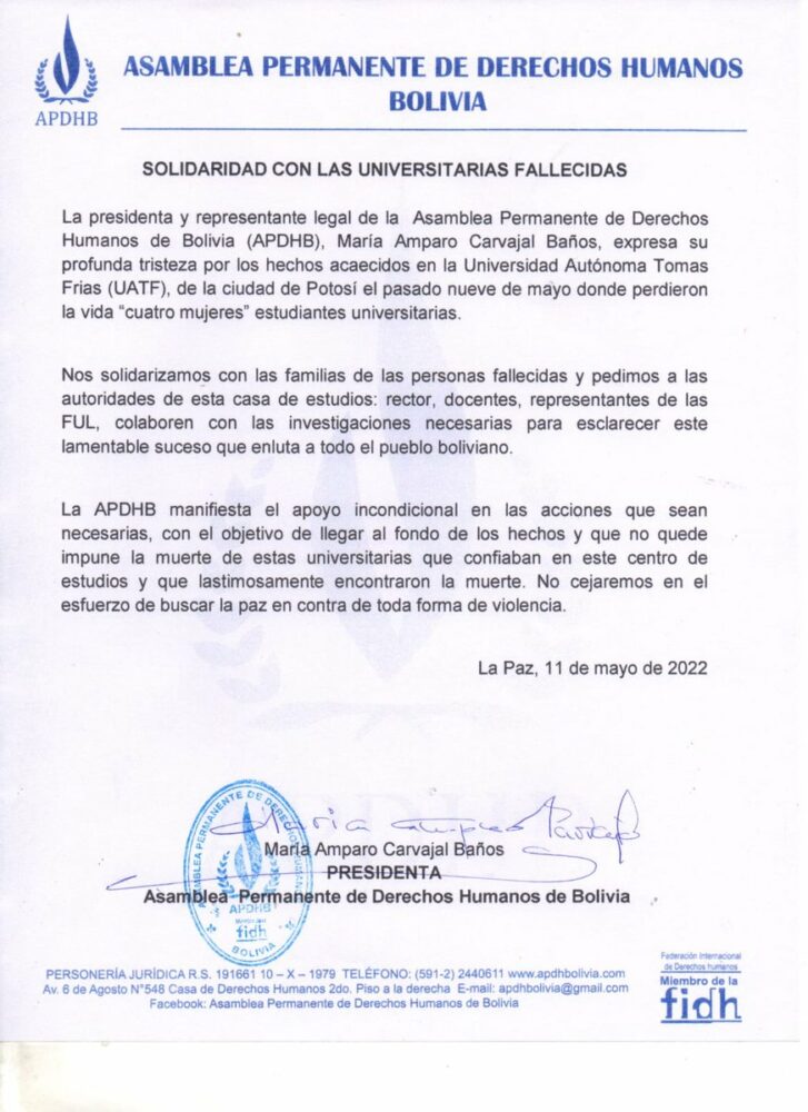🔵 #ANF | #Sociedad La Asamblea Permanente de Derechos Humanos de Bolivia, a tiempo de expresar su solidaridad con las familias de las 4 universitarias fallecidas en avalancha humana por gas lacrimógeno en la Universidad Tomás Frías, pide a las autoridades esclarecer el hecho. https://t.co/QNID44zy7F