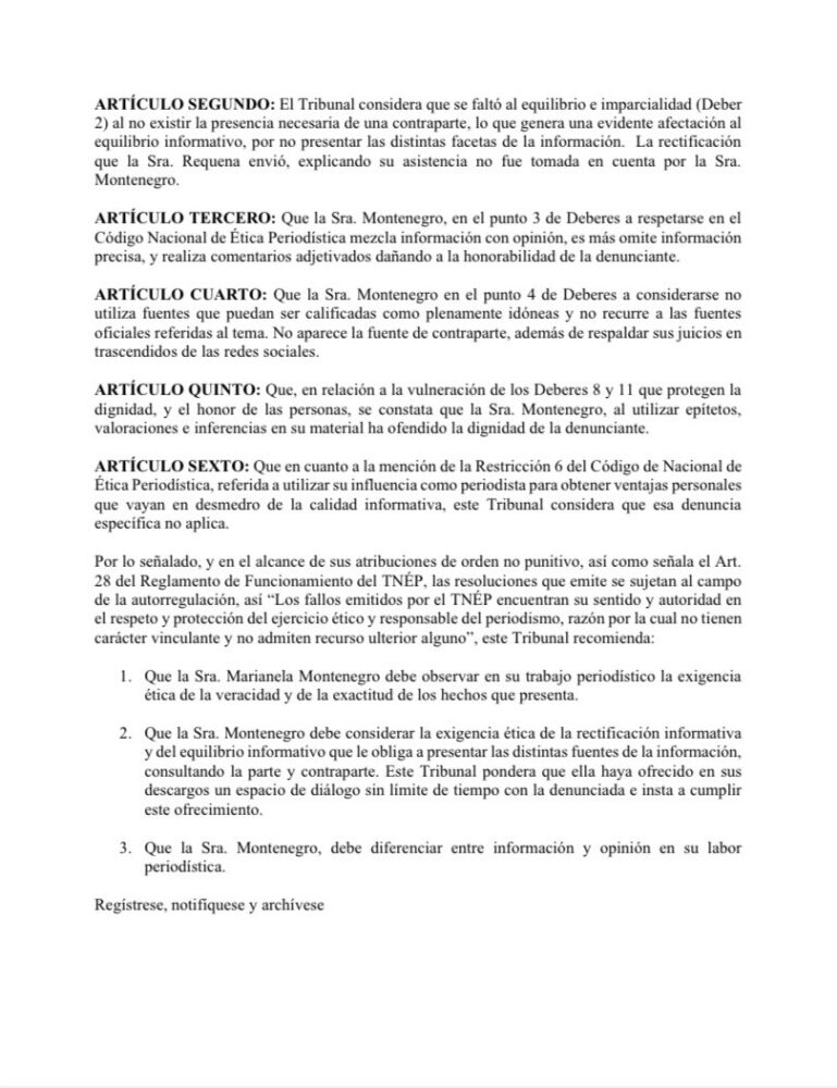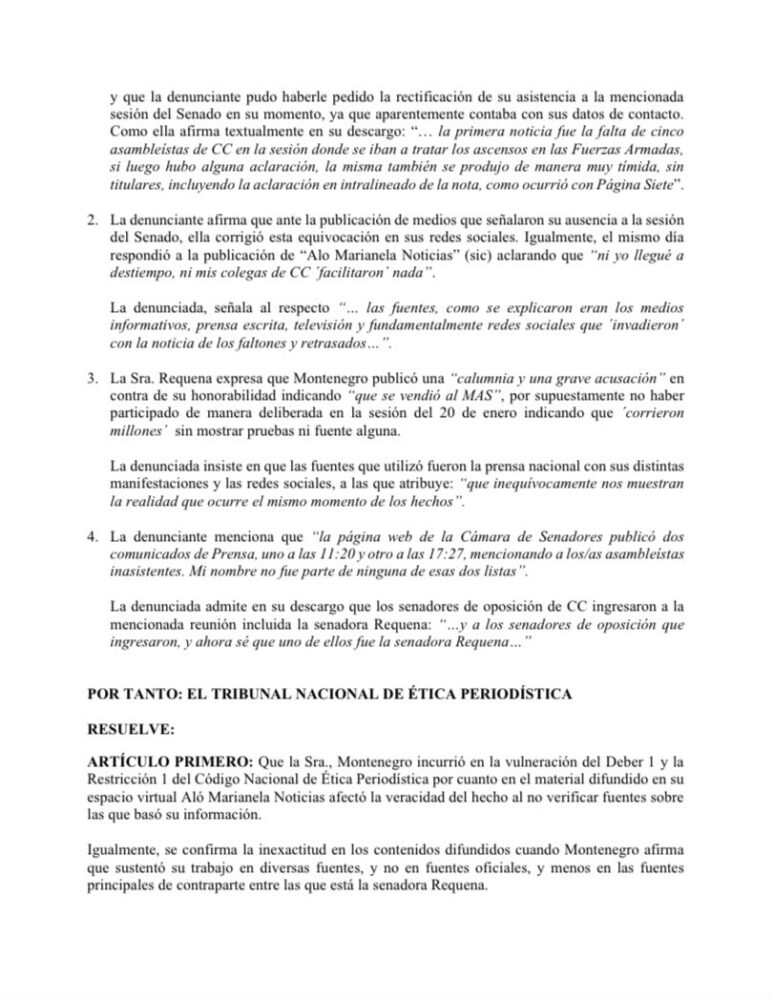 🔵#ANF | Tribunal Nacional de Ética Periodística falló a favor de la senadora de CC, Cecilia Requena, dentro de la denuncia que presentó la legisladora contra Marianela Montenegro, quien, según el Tribunal, incurrió en la afectación de un hecho al no haber verificado sus fuentes. pic.twitter.com/ZGAjYUWNEH