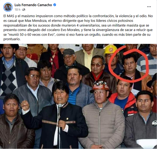 Camacho dice que no es casual que Max Mendoza, el eterno dirigente sea un militante masista