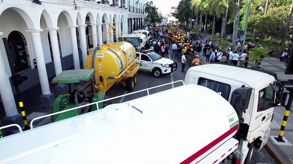 El gobernador Luis Fernando Camacho Vaca, hizo la entrega oficial de 5 cisternas, 4 carretas tanques y 4 camionetas forestales de ataque rápido con equipamiento a los bomberos forestales de la Gobernación cruceña.