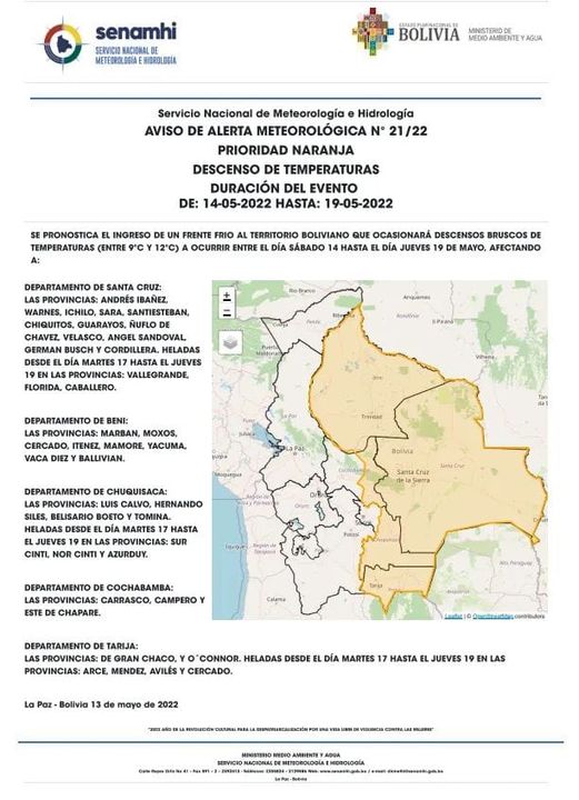 Se pronostica el ingreso de un frente frío al territorio boliviano que ocasionará descensos bruscos de temperaturas (entre 9ºc y 12ºc) a ocurrir entre el día sábado 14 hasta el día jueves 19 de mayo, afectando a: