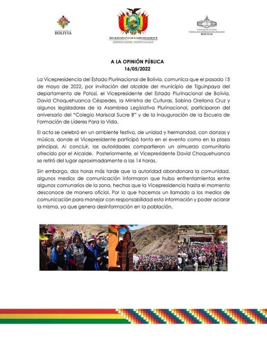 A través de un comunicado, la vicepresidencia señaló que los enfrentamientos en el municipio de Tinguipaya, Potosí, ocurrieron dos horas luego de que el vicepresidente David Choquehuanca se fuera del lugar tras haber inaugurado la Escuela de Formación de Líderes para la Vida.