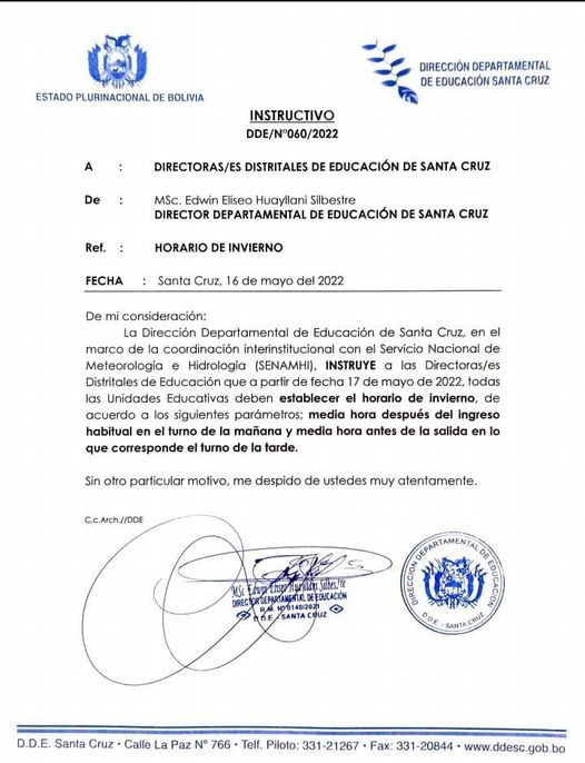 La Dirección Distrital de Educación instruye el horario de invierno.