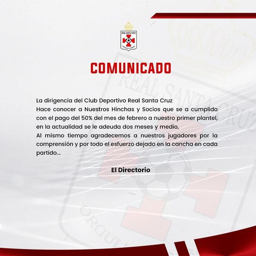 Comunicado de la dirigencia de #RealSantaCruz se cumplió con el pago del 50% de sueldo del mes de febrero al primer plantel.