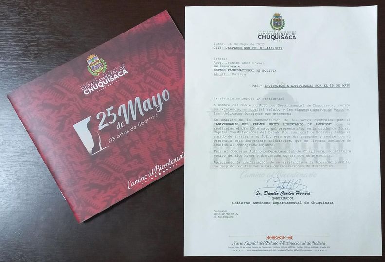 El gobernador de #Chuquisaca, Damián Condori, invitó de manera formal a Jeanine Añez para que participe de los actos protocolares del 25 de mayo por el Aniversario del Primer Grito Libertario de América, en calidad de expresidenta del Estado.