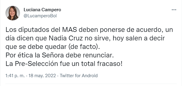 🔵 #ANF | La diputada de CC, Luciana Campero, dice que Nadia Cruz, por ética, debe renunciar. "Los diputados del MAS deben ponerse de acuerdo, un día dicen que Nadia Cruz no sirve, hoy salen a decir que se debe quedar", escribió en su cuenta de twitter. pic.twitter.com/6lEHb8vXAB