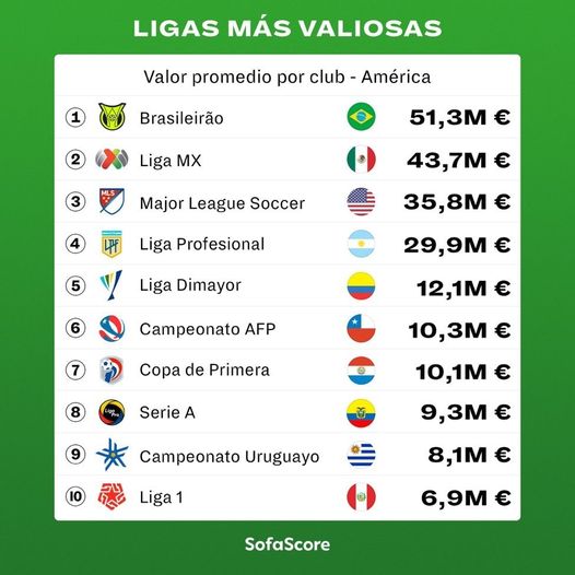 ¡Las Ligas más valiosas de América! 💰 Teniendo en cuenta el valor de mercado promedio por club, estas son las competencias más valuadas actualmente en la región. Dato: @sofascore_official