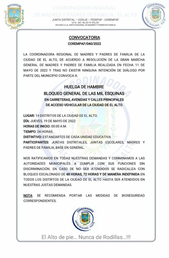 🔵#ANF | #Sociedad Padres de familia de #ElAlto anuncian bloqueo de "las mil esquinas" para este jueves ante la falta de atención de autoridades de la Alcaldía a sus demandas. pic.twitter.com/exGQj7k44P