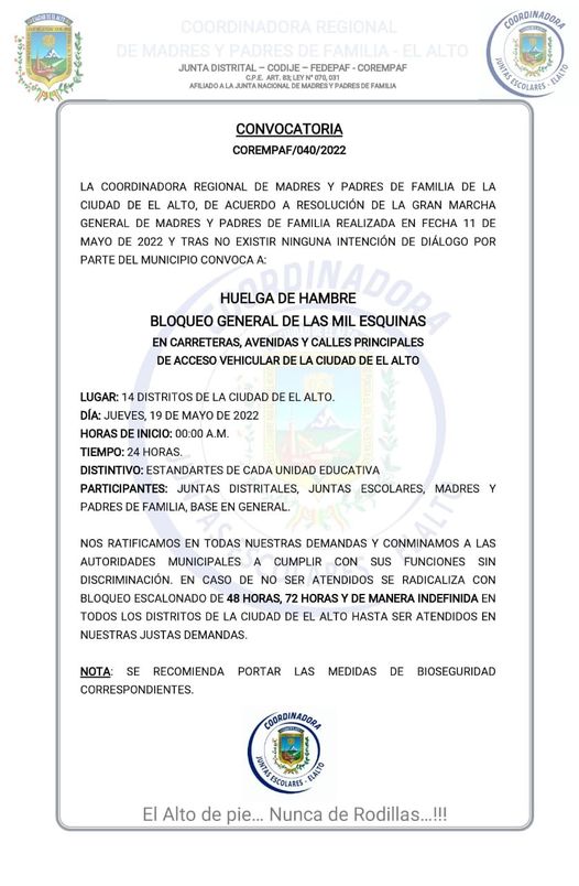 #ElAlto: Padres de familia anuncian bloqueo de «las mil esquinas» para este jueves
