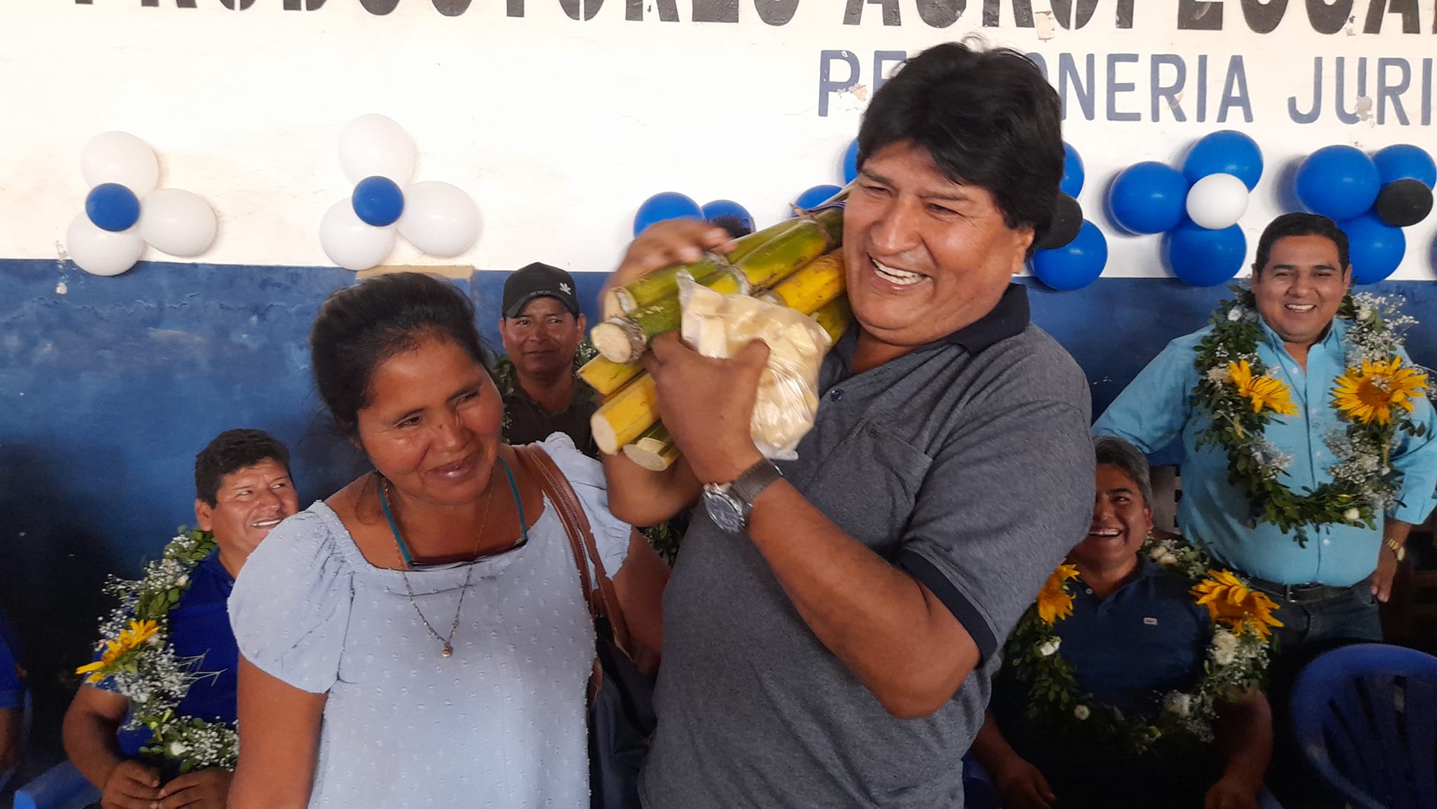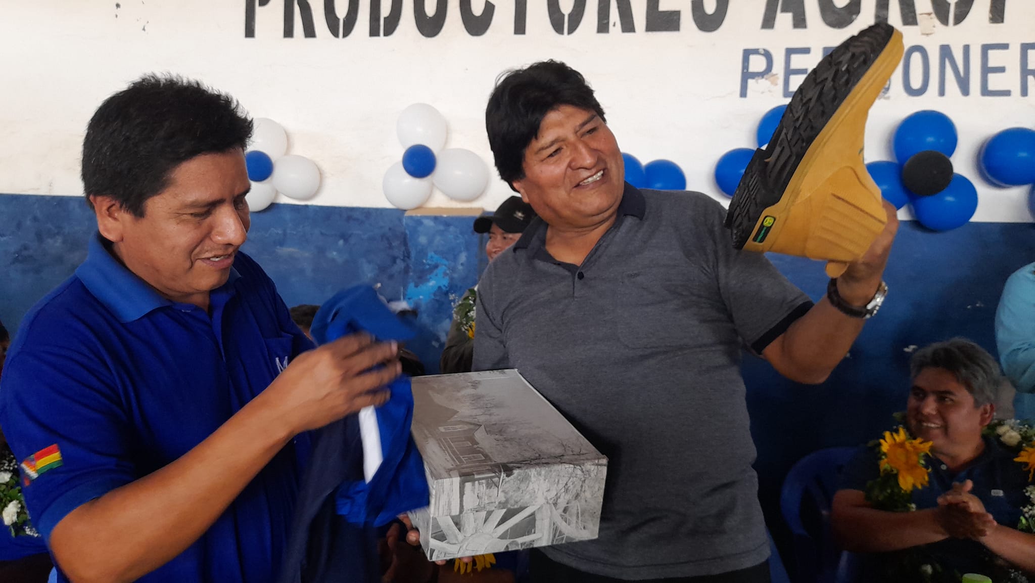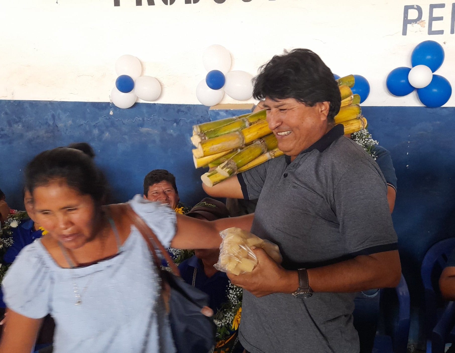 Hermanas productoras y pequeños empresarios mientras se desarrollaba el ampliado ordinario de la Federación de Interculturales en San Julian Norte, se acercaron al máximo líder de las organizaciones sociales del país para obsequiarle caña y zapatos de cuero.