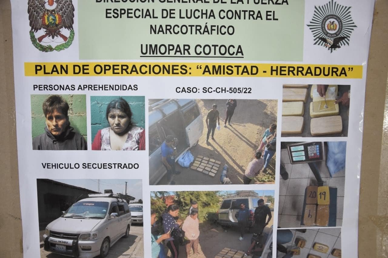 3. En un patrullaje rutinario, el 18 de mayo, en el barrio integración del oriente, se logra identificar un vehículo con personas que al ver la presencia de los efectivos sospechosamente se dan a la fuga, en presencia de los vecinos se procede a revisar el minibús NOAH encontrando en su interior, una bolsa de yute con 20 paquetes con un peso de 20 kilos con 400 gramos de pasta base de cocaína. Pero tras un rastrillaje de la zona con el apoyo de los vecinos, se logra aprehender a Braulio Choque Aldaba y A Juliana Condori Juárez.