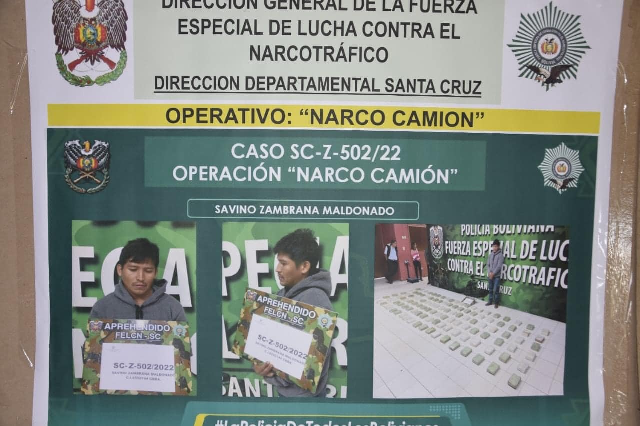 4. El 18 de mayo, personal de la Felcn en un dispositivo estático de control en la carretera Santa Cruz – Yacuiba, un conductor de un vehículo tipo camión marca T-King, en la entrevista genera contradicciones por lo que se procede a la revisión del motorizado, donde se evidencia alteraciones en la estructura de la plataforma logrando encontrar en su interior 120 paquetes, con un peso de 122 kilos con 900 gramos de cocaína, se aprehende al conductor y el secuestro del vehículo.