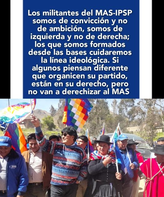 «Acá somos pues un movimiento político con ideología y con principios, y no comparto con algunos ministros (que) dicen que en el MAS ‘convergen diversas corrientes políticas, lo que no quiere decir que esté dividido’. No hay diferentes corrientes políticas, por favor; algunos miembros de nuestro gobierno nacional ¿qué están queriendo decir?, ¿que aquí hay derecha, izquierda?», cuestionó.