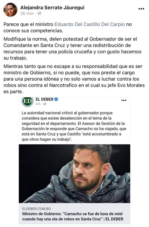 Serrate contra Del Castillo: “Den potestad al Gobernador Camacho ser ser comandante de Santa Cruz”…