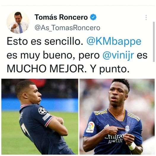 Tomas Roncero, lo tiene claro Vinicius es mejor.Categorías DeportesEtiquetas , Facebook, Play Deportes 22/05/2022 Tomas Roncero, lo tiene claro Vinicius es mejor. Fuente: Play Deportes => Recibir por Whatsapp las noticias destacadas