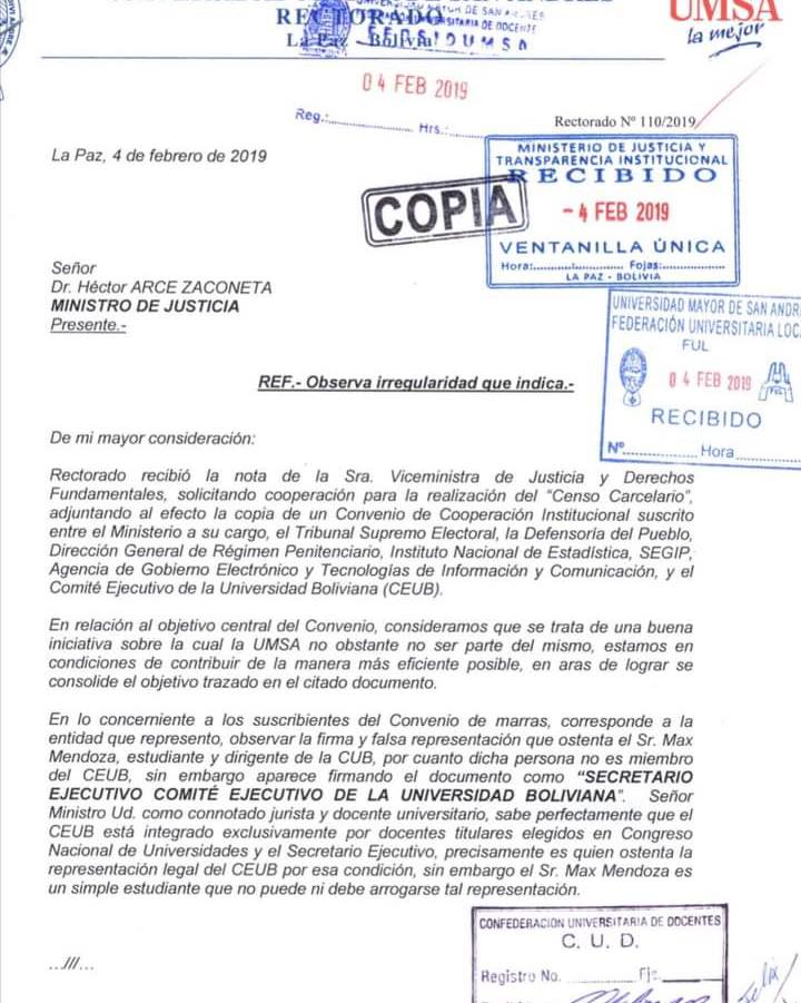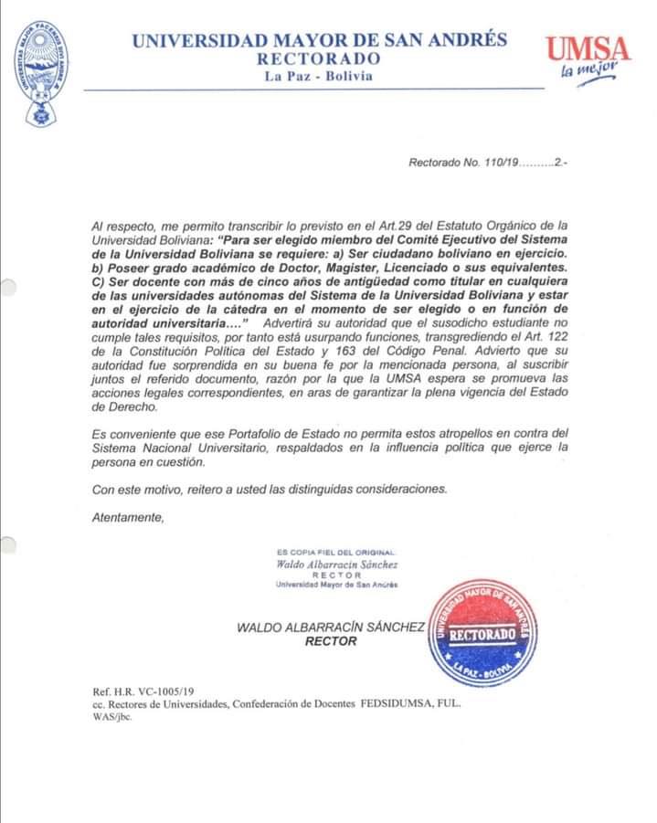 El 4 de febrero de 2019, Waldo Albarracín Sánchez, entonces Rector de la Universidad Mayor de San Andrés (UMSA), se dirige ante el Ministro Héctor Arce Zaconeta, para denunciar a Max Mendoza (dirigente universitario), por irregularidades y por usurpación de funciones, sin que se conozca actuación alguna por parte de dicho Ministerio.