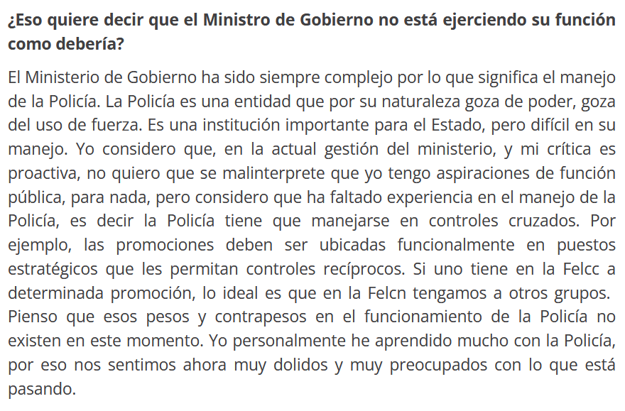 El exministro Carlos Romero hizo una critica «proactiva» sobre el manejo de la Policía y señaló que «ha faltado experiencia en su manejo». Asimismo, indicó sentirse «dolido y muy preocupado» con lo que está pasando en la institución.