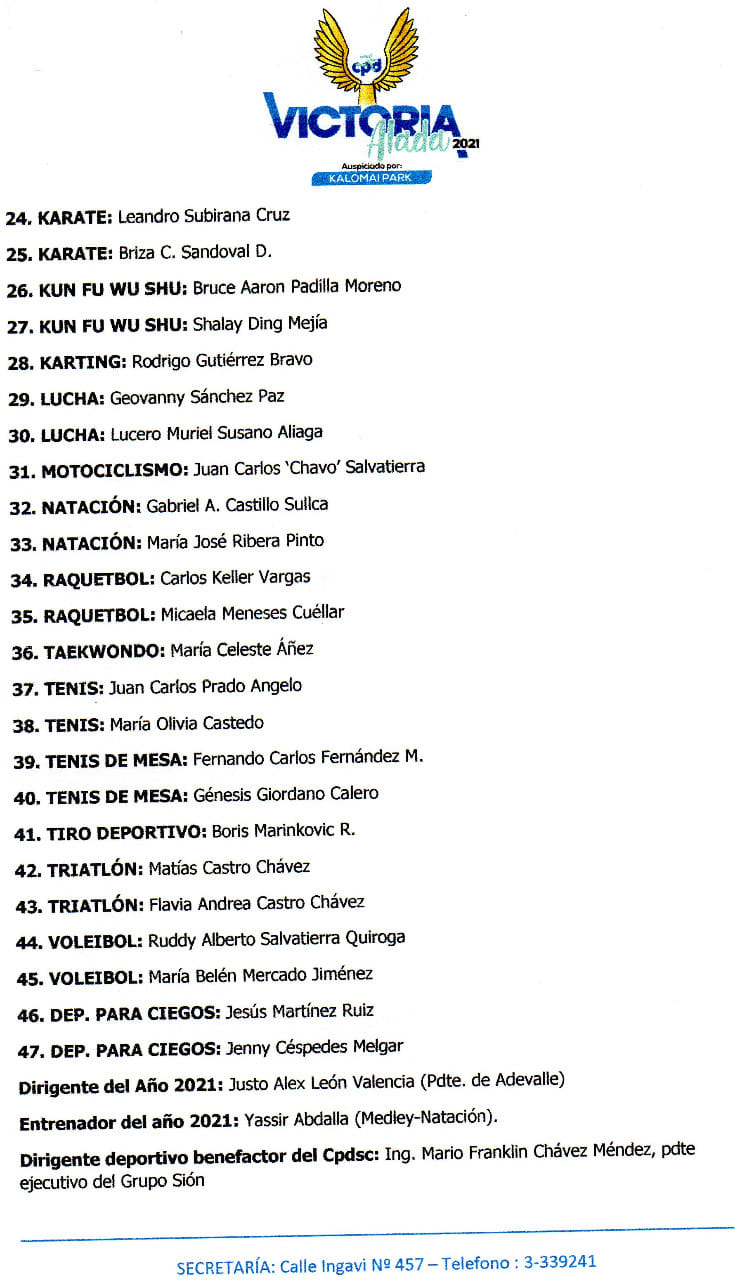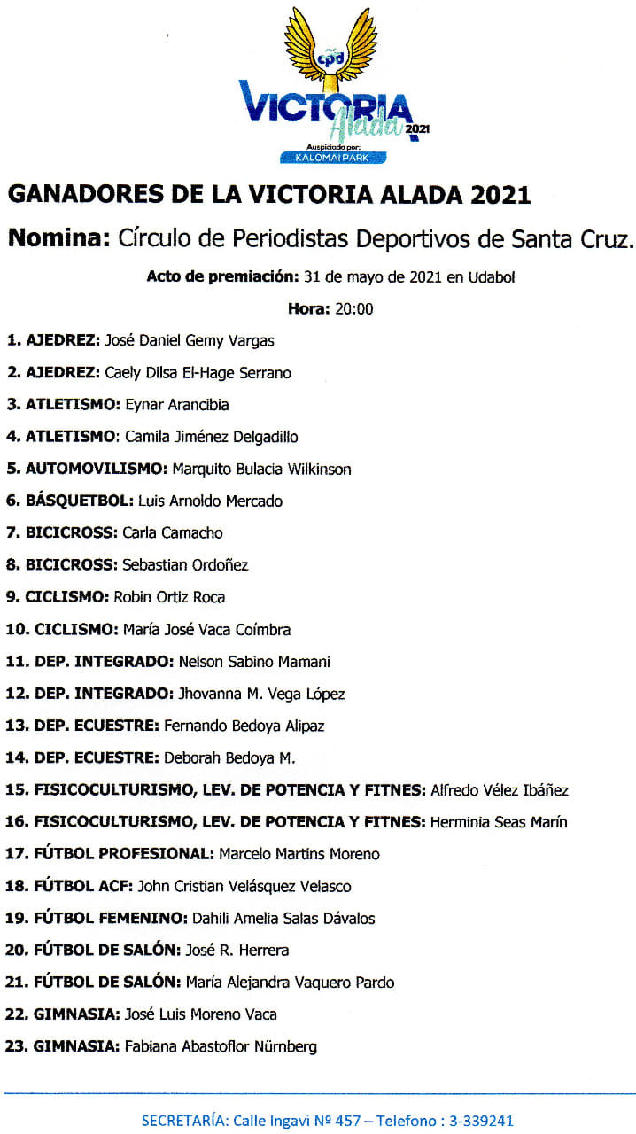 El Círculo de Periodistas Deportivos de Santa Cruz, dió a conocer la lista de los Deportistas Destacados Cruceños que serán Premiados con el galardón de la Victoria Alada, además, durante el acto del 31/05/2022, se premiará al mejor de los mejores con la Victoria Alada Dorada.