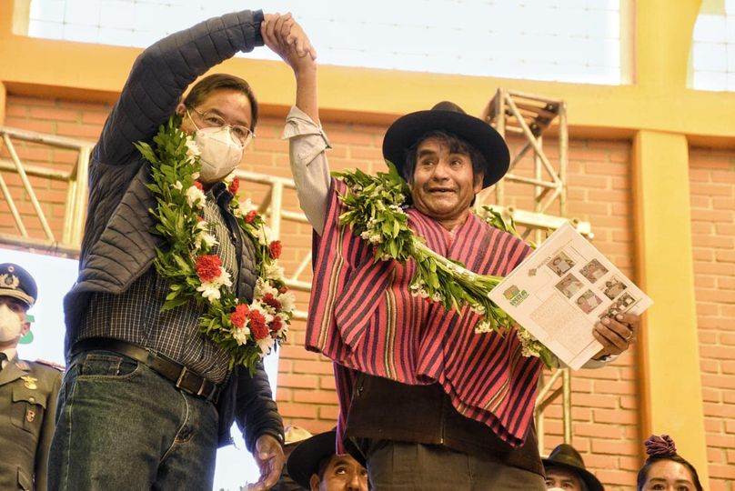 El presidente Luis Arce Catacora, el vicepresidente David Choquehuanca y el ministro de Desarrollo Rural y Tierras, Remmy Gonzales, entregan obras a los chuquisaqueños en el marco de la celebración de los 213 años de la efeméride departamental.
