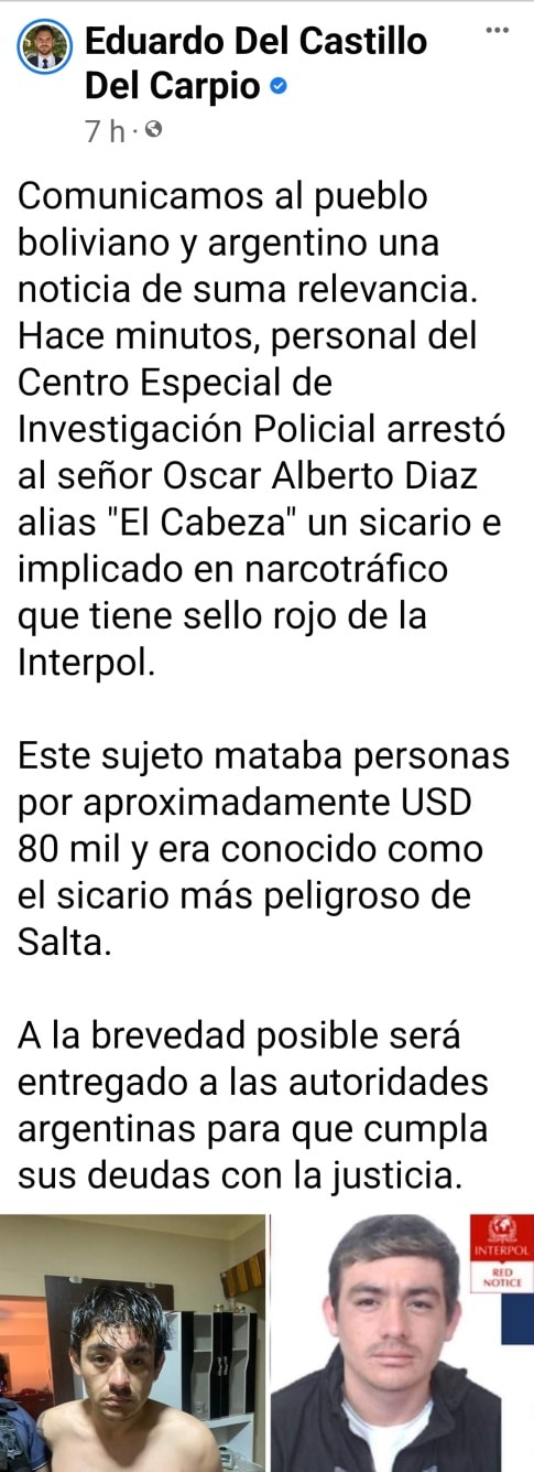 El Ministro de Gobierno confirma que atrapan a sicario que era buscado en Argentina, involucrados en narcotráfico se sabe que el hombre asesinaba a sangre fría por 80 mil dólares, será enviado a Argentina a la brevedad posible.