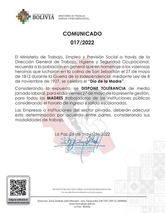 Ministerio de Trabajo dispone tolerancia laboral el 27 de mayo por el #DiaDeLaMadre