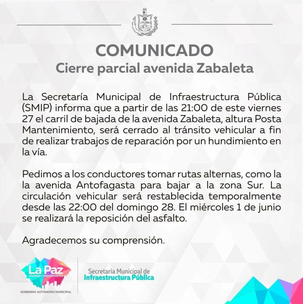 🔵 #ANF | #Sociedad La Alcaldía de #LaPaz informa a la población que a partir de las 21:00 de este viernes, el carril de bajada de la avenida Zabaleta será cerrado para realizar trabajos de reparación en la vía. https://t.co/9l9RHg9zHt