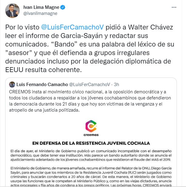 #ANF | #Política El ministro de Justicia @ivanlimamagne acusa al exasesor político del @BOmereceMAS Walter Chávez de redactar el comunicado que difundió la alianza política Creemos, en defensa de los integrantes de la Resistencia Juvenil Cochala (RJC). https://t.co/nOtSSkVfrX