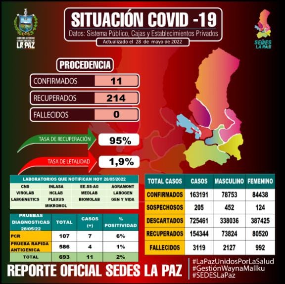 🔵#ANF | #Sociedad El Servicio Departamental de Salud de La Paz reportó este sábado 11 casos positivos de #COVID19, ningún fallecido y 214 recuperados. https://t.co/zL3Jt33GOA