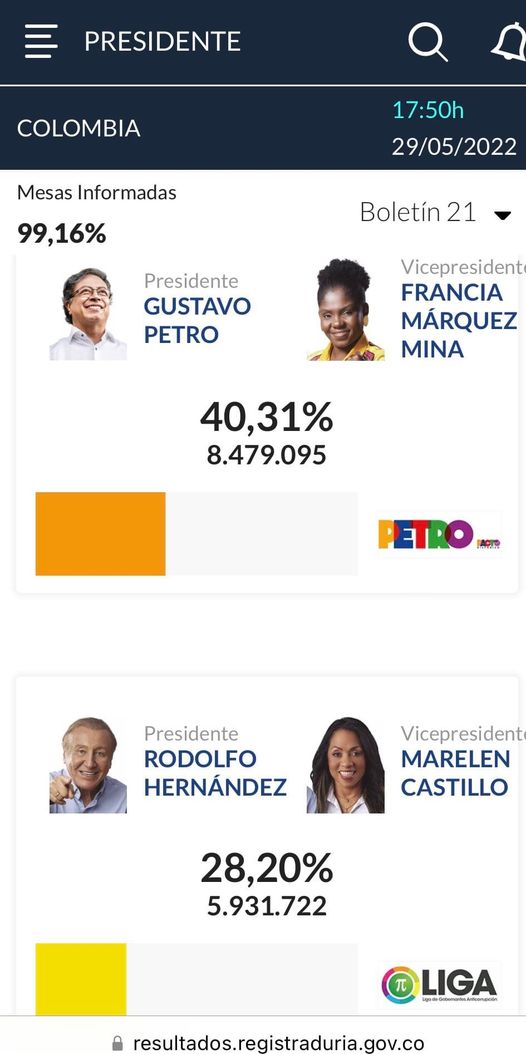 El ministro de Justicia, Iván Lima, informó que al 99,16% de mesas Informadas la victoria de Gustavo Petro va a una segunda vuelta el 19 de junio. «Colombia en camino a un cambio histórico que configura una nueva región andina y sudamericana», señaló.
