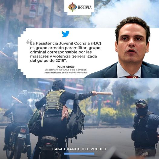 Paulo Abrāo, exsecretario ejecutivo de la Comisión Interamericana de Derechos Humanos #CIDH, destaca el anuncio del Ministerio de Gobierno Bolivia de iniciar procesos contra miembros de la Resistencia Juvenil Cochala (RJC), grupo paramilitar corresponsable de las masacres y violaciones a los derechos humanos durante el golpe de estado.