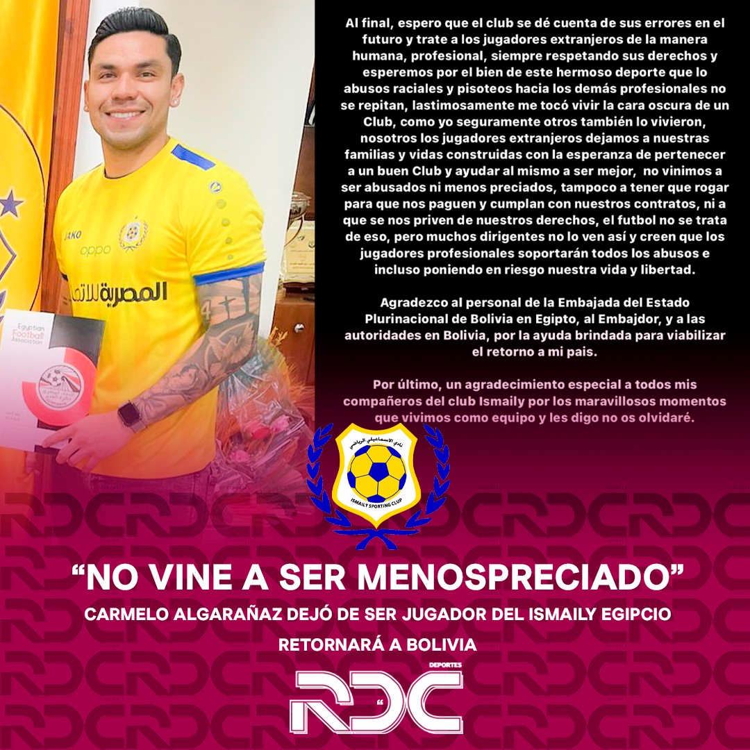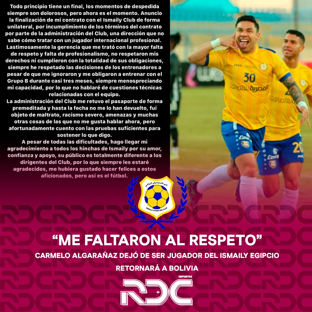 El jugador boliviano anunció en sus redes sociales el término de su vinculo con el club de Egipto. En su publicación, señaló ser menospreciado, maltratado, que los dirigentes del club no cumplieron con lo estipulado en el contrato, y hasta señala que le retuvieron el pasaporte boliviano.