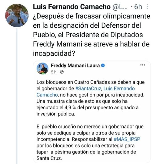 Así responde Camacho a Mamani por llamarlo incapazCategorías NoticiasEtiquetas , Agustín Zambrana en El Bunker, Facebook 31/05/2022 Así responde Camacho a Mamani por llamarlo incapaz 👇 Fuente: Agustín Zambrana en El Bunker