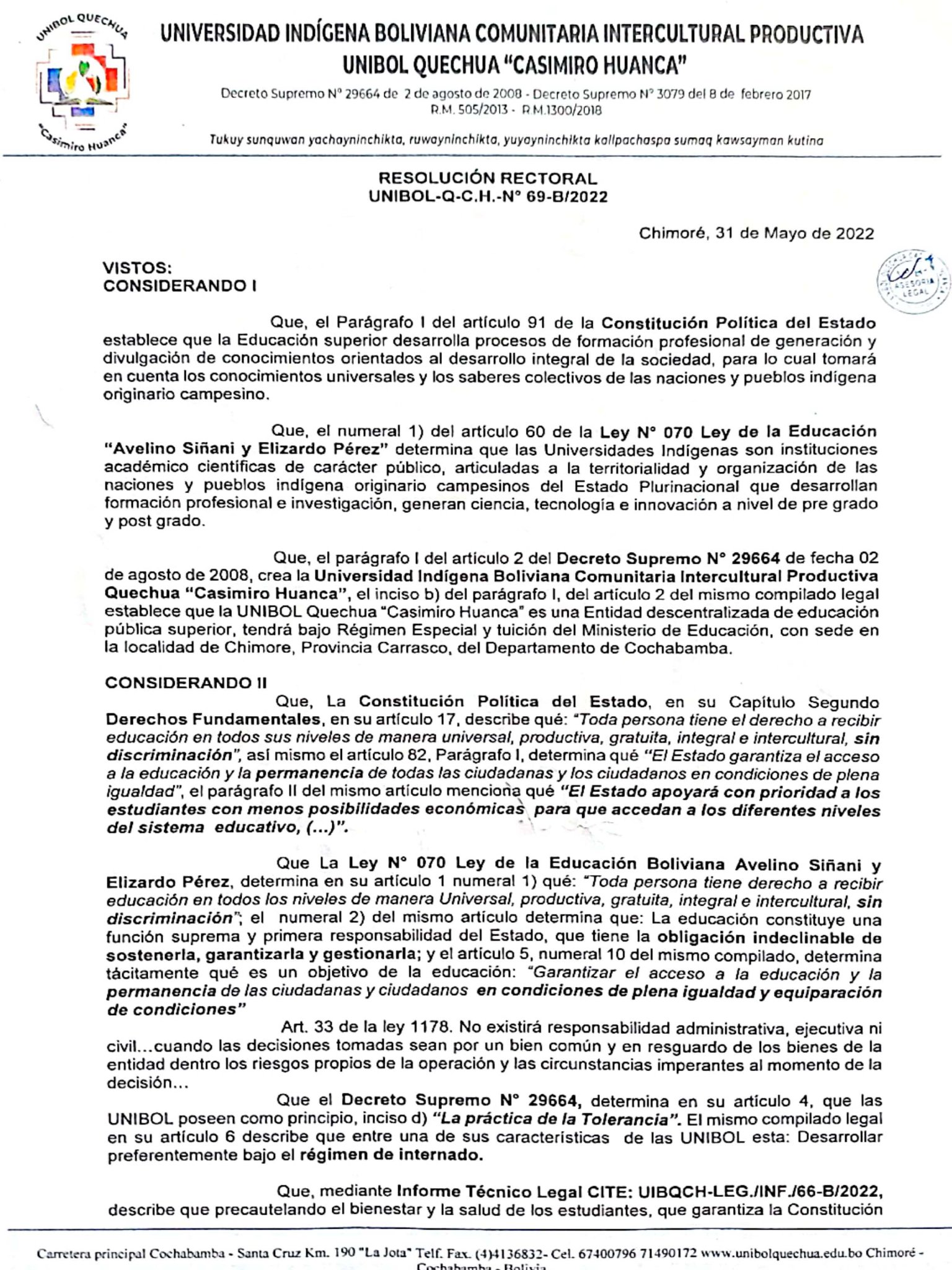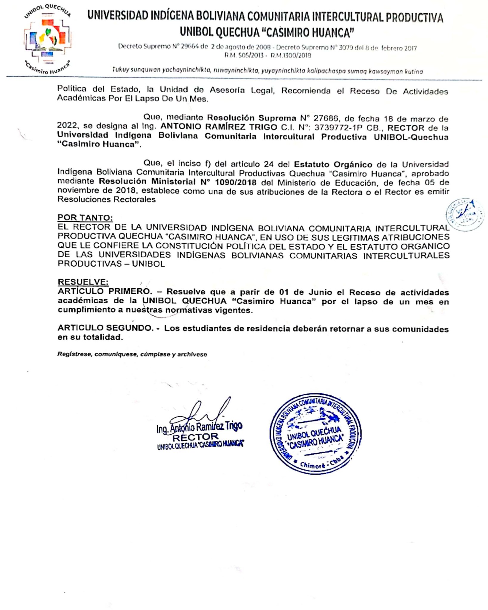 La Universidad Indígena Boliviana Comunitaria Intercultural Productiva UNIBOL QUECHUA “Casimiro Huanca”, a la conclusión de la reunión con el Viceministro de educación, rector de la UNIBOL QUECHUA, organizaciones sociales de la federación de Chimoré y estudiantes, resuelve receso de las actividades académicas en la casa superior de estudios por el lapso de un mes.