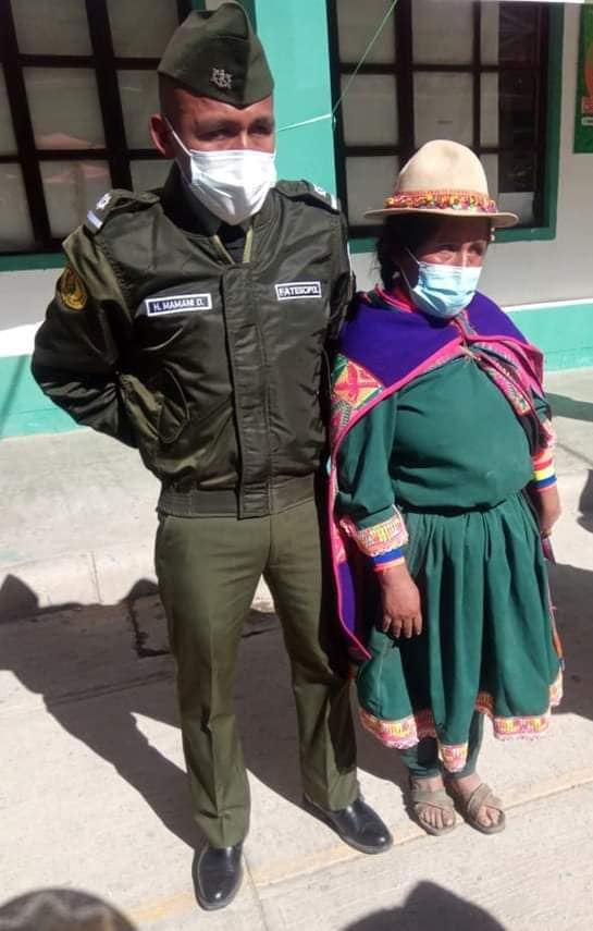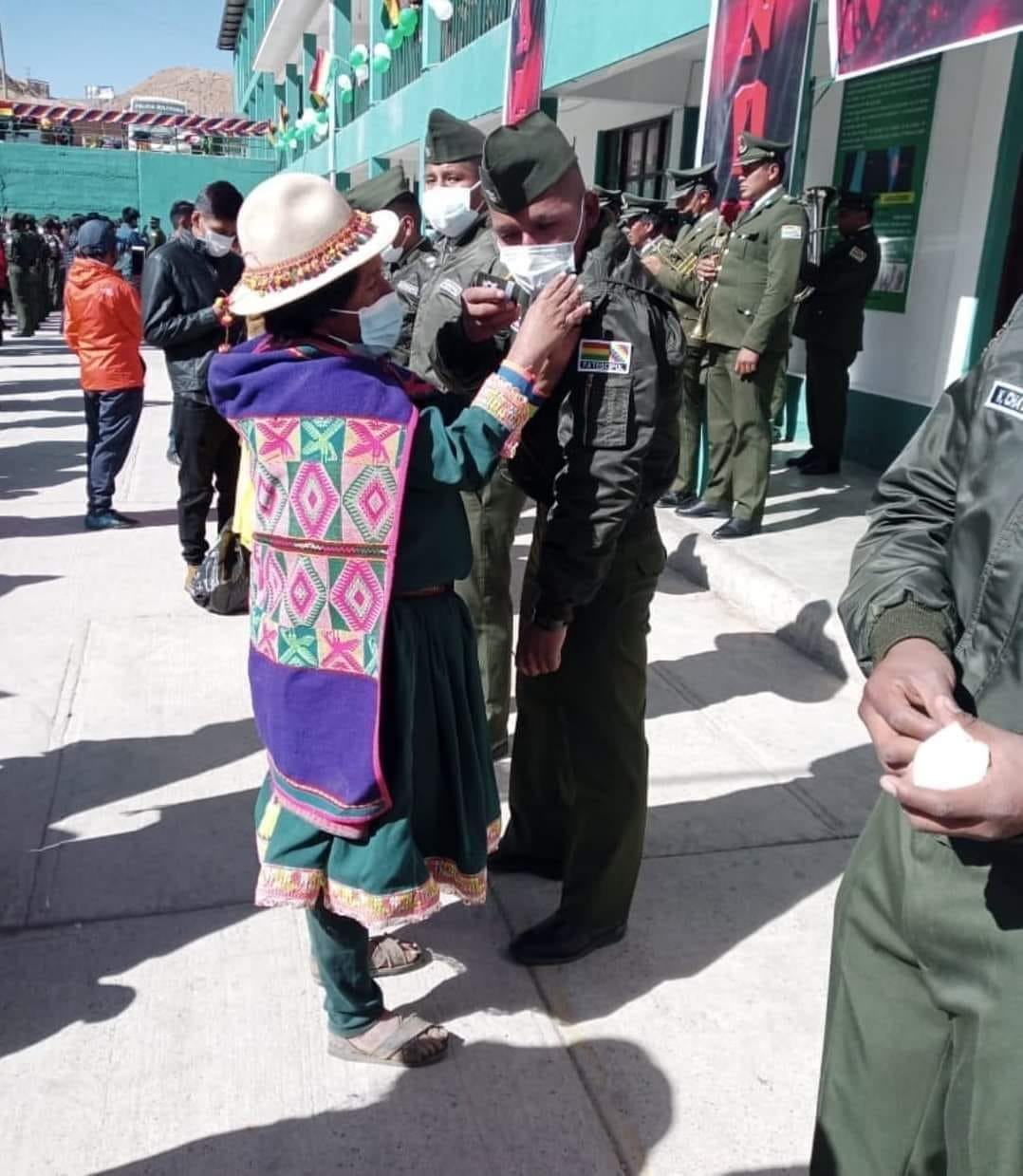 Hipólito Mamani Dorado, alumno de primer año de la Facultad Técnica Superior en Ciencias Policiales (Fatescipol), en homenaje al día de la madre, recibió sus primeros grados por parte de su mamá, quien llegó con la vestimenta característica de su comunidad. 📸 #RRSS