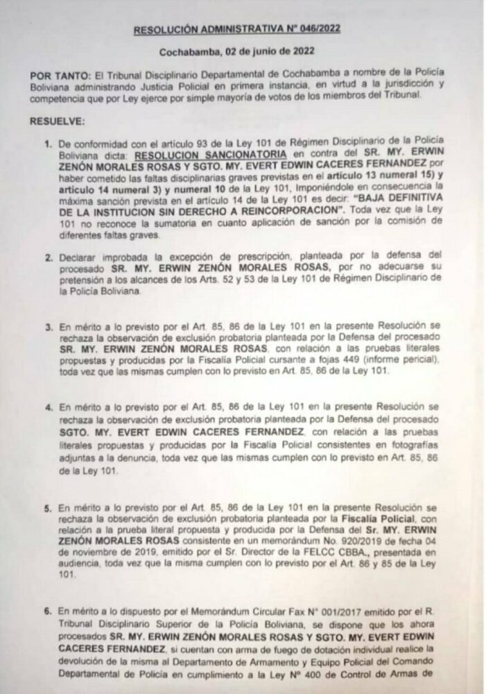 Informamos al pueblo boliviano de la baja definitiva del ex My. de la #PolicíaBoliviana, Erwin Morales y el ex sgto. My. Edwin Cáceres por cometer faltas disciplinarias graves. Un paso más para dar justicia al pueblo boliviano, por los lamentables hechos acaecidos el 2019. https://t.co/SZTyDqx5D6