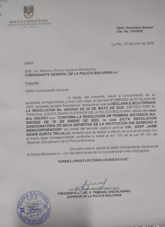 1/2 Informamos al pueblo boliviano que el recurso de apelación presentado por el ex Cnl. Jaime Zurita, ex comandante Departamental de la Policía de #Cochabamba durante la masacre de #Sacaba… https://t.co/9UwXQ5rHLV