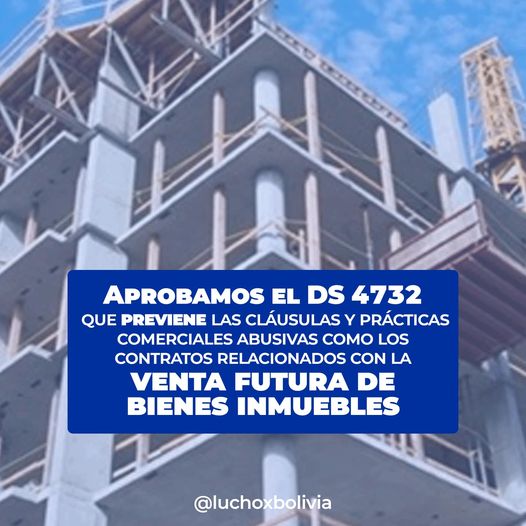 Para precautelar los derechos de las y los bolivianos que suscriben contratos en preventa de cualquier bien inmueble, aprobamos el DS 4732, que previene las cláusulas y prácticas comerciales abusivas incluidas en los contratos relacionados con la venta futura de bienes inmuebles.
