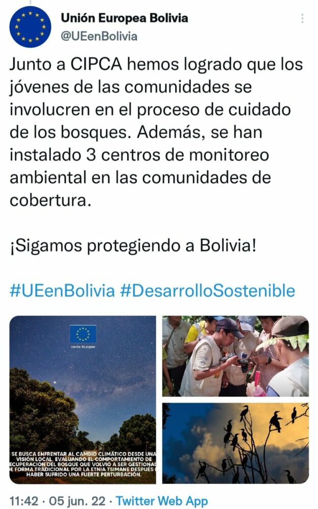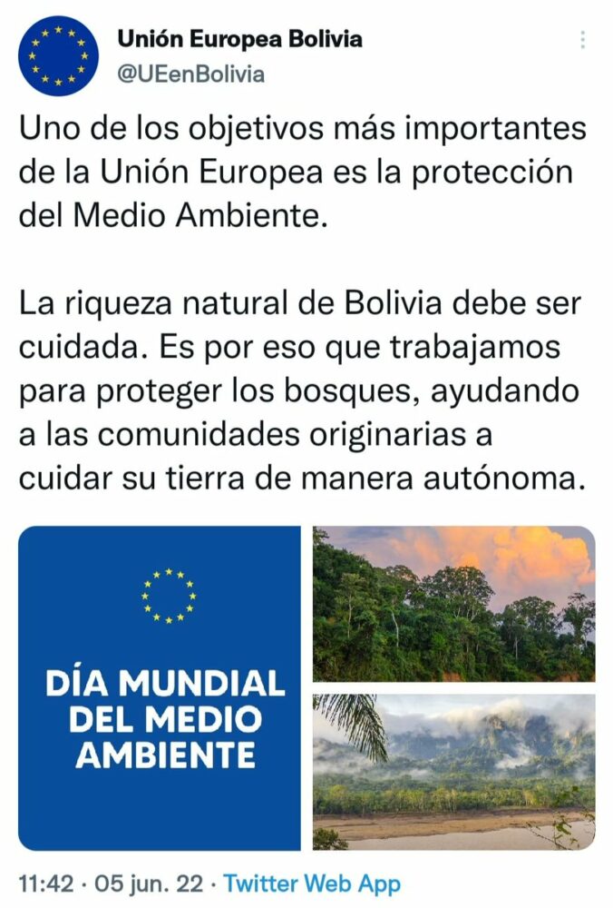🔵#ANF | #Sociedad En el Día Mundial del Medio Ambiente, la Unión Europea destacó la riqueza natural de Bolivia y señaló que trabajan coordinadamente para la protección de los bosques y ayudar a las comunidades originarias. https://t.co/ei6CK6mZ9h