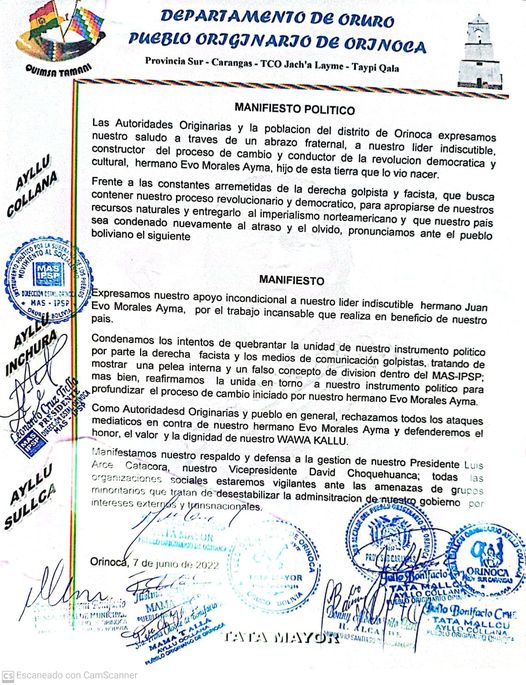 // Pronunciamiento de Orinoca . Apoyo incondicional a nuestro líder hermano Evo Morales Ayma y rechazo a los intent…