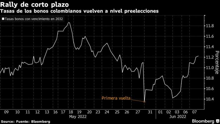 #Colombia | Comportamiento de los bonos con vencimiento en 2032. Hernández tiene que ser mucho más claro respecto de lo que plantea para la economía para calmar a los inversores, que ven incertidumbre creciente a pesar de los resultados en primera vuelta. https://t.co/E3vqenoeEl