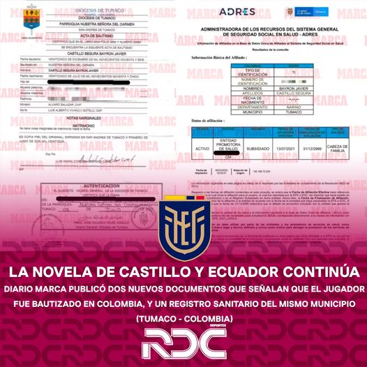 El portal Marca publicó dos nuevos documentos en los que se basa Chile para evitar que Ecuador participe en Qatar 2022. El primer documento es un certificado de bautizo emitido el 1 de Junio de este año. Ahí señalan que el jugador fue bautizado en la Diócesis de Tumaco (Nariño, Colombia).