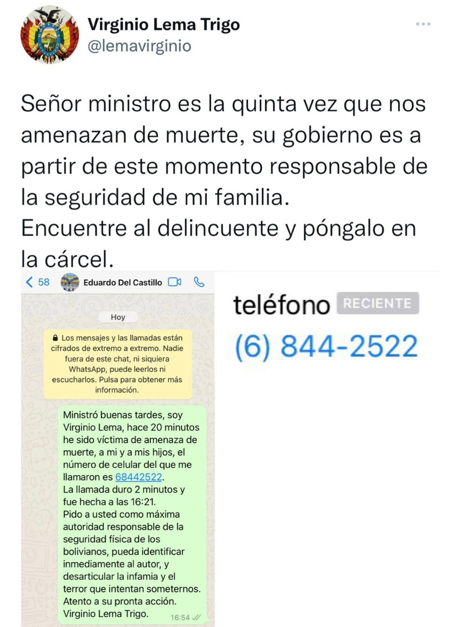 Según Lema, esta sería la quinta vez que recibe amenazas de muerte. «Pido a usted como máxima autoridad responsable de la seguridad física de los bolivianos, pueda identificar inmediatamente al autor, y desarticular la infamia y el terror que intentan someternos», indicó.