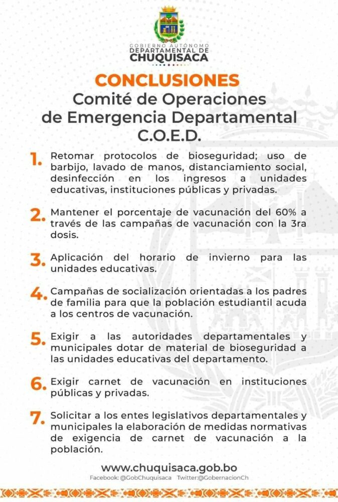 🔵 #ANF | El Comité de Operaciones de Emergencia Departamental (COED) de #Chuquisaca determinó exigir el carnet de vacunación en las instituciones públicas y privadas. pic.twitter.com/Q3oySArZs5
