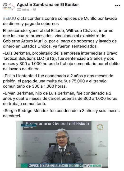 El día de ayer, el procurador general, Wilfredo Chavez, anunció que socios de Murillo habían sido condenados por la justicia estadounidense. Lo que no dijo es que esto no fue en el caso que el estado boliviano le sigue a Murillo y sus supuestos cómplices. Las aprehensiones fueron por el caso penal que sigue la fiscalía de Estados Unidos. En este caso Bolivia no es parte ni testigo ni tiene acceso a la documentación. Sin embargo envía abogados a las audiencias públicas, a costo de todos los bolivianos.