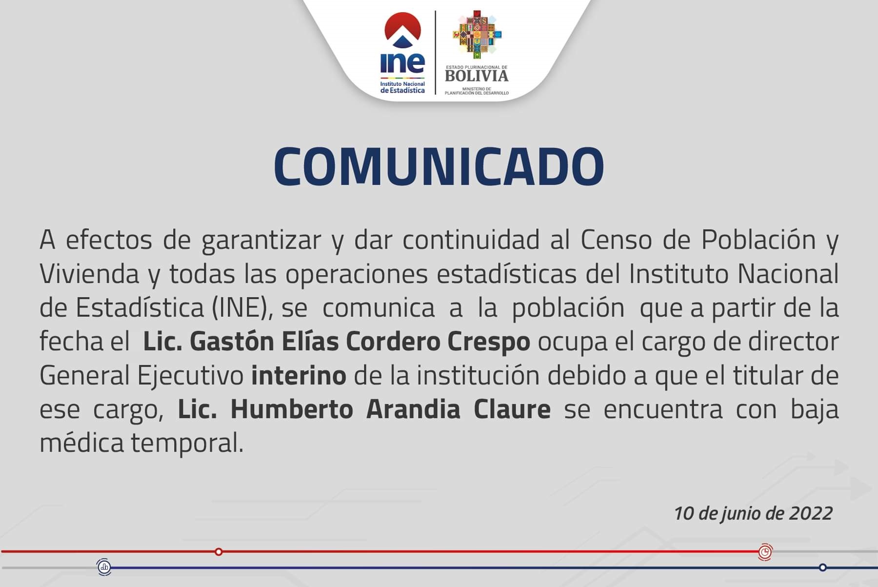 El ministro de Planificación del Desarrollo, Sergio Cusicanqui, designó este viernes a Gastón Cordero como el director interino del Instituto Nacional de Estadística (INE) mientras que Humberto Arandia se encuentra con baja médica.