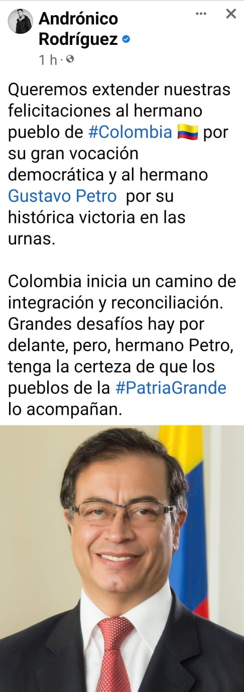 El Presidente del Senado Andrónico Rodríguez felicita a Gustavo Petro.