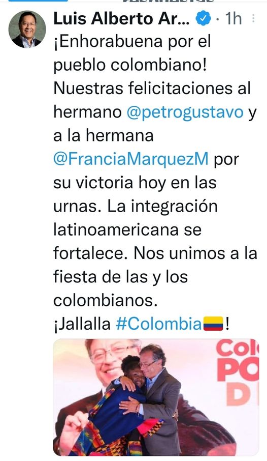 Luis Arce felicita a Gustavo Petro por su triunfo en las elecciones de Colombia.